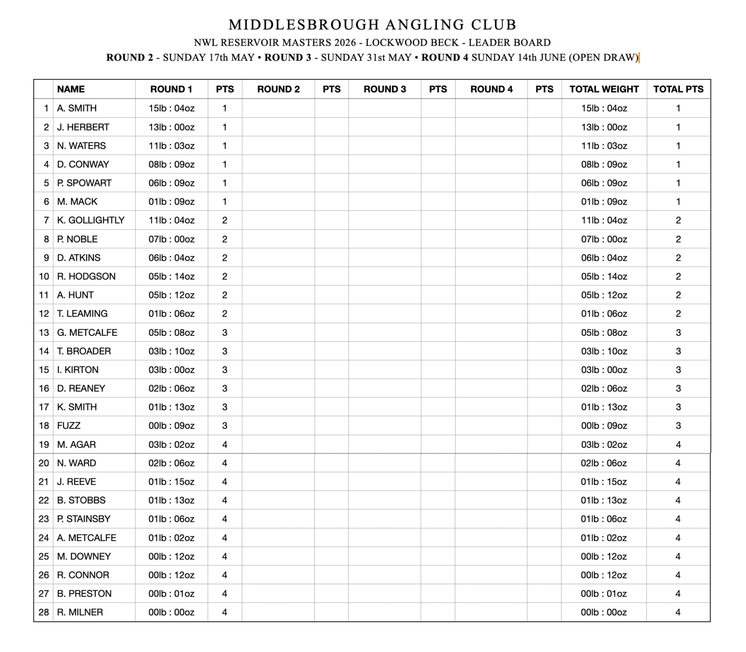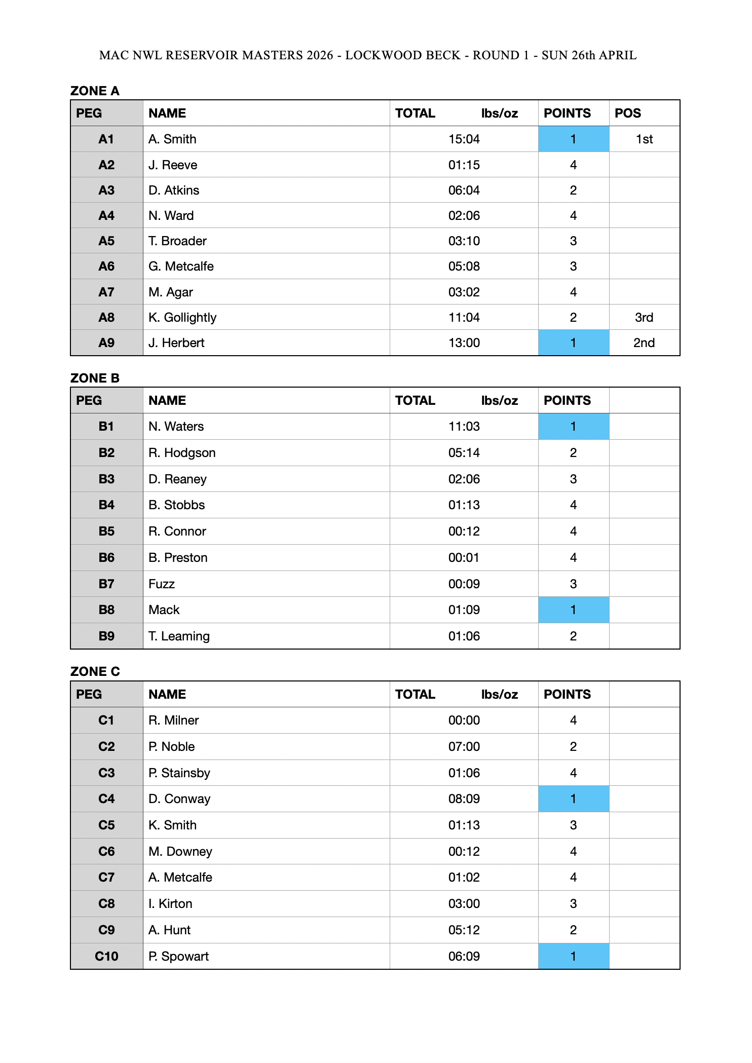 M.A.C. NWL RESERVOIR MASTERS SERIES 2026 – LOCKWOOD BECK – ROUND 1 RESULTS… Anth Smith took the overall honours – with pole out-fishing the feeder and end pegs playing their part – as this years competition kicked-off in mild spring weather and the top three weights coming from A zone in the woods.